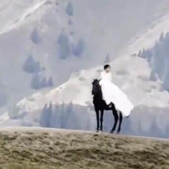 注意看,网友旅游偶遇情侣在山顶拍婚纱照,身后有大山,脚下是草原,女生穿着洁白的婚纱骑着马,加上女生无意间的神运镜,一切都是那么美好。